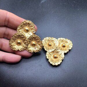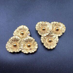 Pair of Dress Clips in Gold Gilt Triple Flowers Design, exuding an antique style. These vintage clips are gold-toned and made from metal, each measuring 1.75".