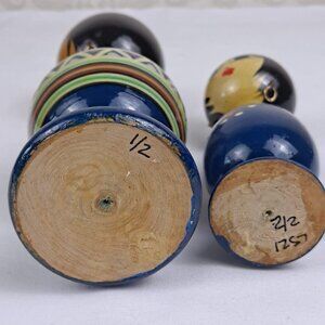 This is a pair of Egyptian spindle dolls. Each has been made by hand from one piece of wood and then hand painted. They both still have their "earrings". Vibrant colors. Beautiful accent pieces for your home or office decor.