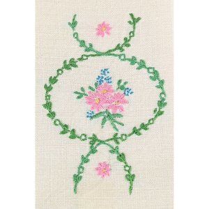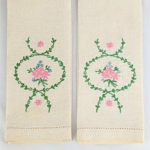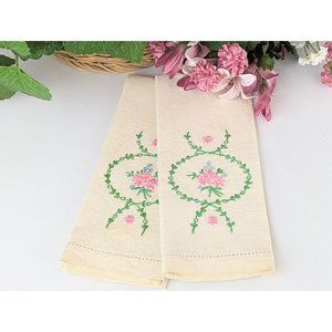 Pair of Embroidered Linen Tea Towels Vintage Cream Linen Hand Towels Pink Floral