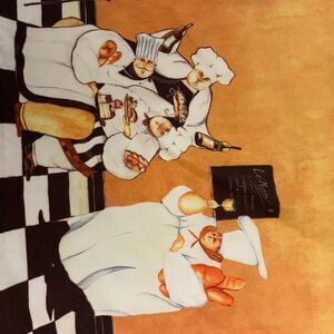Fat Chef cafe curtain/toppers. French cafe scene. Adorable paris scene- fat chefs with wine bread dessert. 80 % poly 20% cotton - come right out of the dryer wrinkle free. Cute addition to your francophile kitchen. 15.5"x 50". Hemmed 3" opening for rod. #kitchen #french #fatchefs
