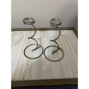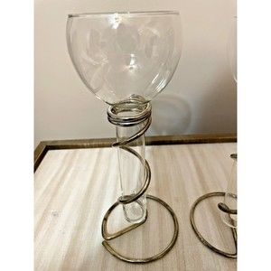 Pair of vintage floating candle holders are can be used for rooting plants. I believe the holder is silver plated. The glass candler holders hold a long taper candle. With the glass container in the stand it measures approimately 10.5 inches tall, out of stand approximately 9.5 inches tall. The base of the stand is approximately 4.25 inches in daimeter. The top of the vial is approximately 3.25 inches in diameter. No breaks or cracks in the glass vial. Stand does show some discoloration which may be corrected with a good polishing.