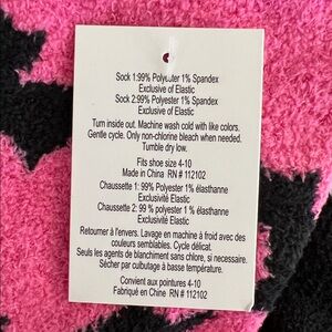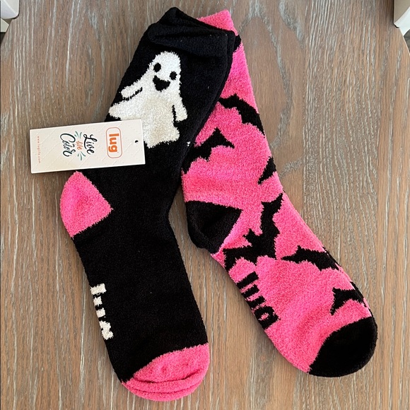 Soft plush socks with a fun ghost and bats motif. Bold pink and black design.
