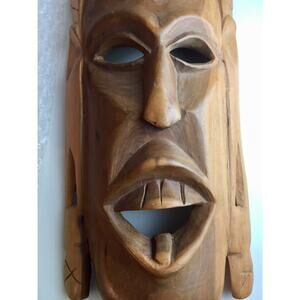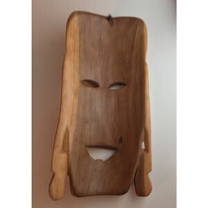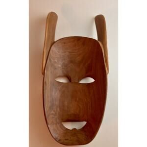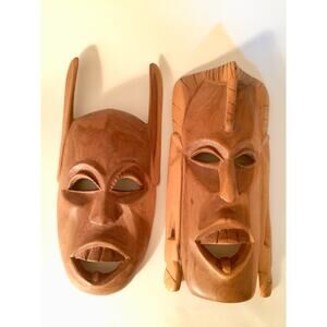 Each mask has its own personality and craftsmanship, with dimensions of 12 3/8" x 5 7/8" and 12 3/4" x 5 7/8". Both masks are in great vintage condition, though one mask does not have a hanger—perfect for display on a wall, shelf, or incorporated into a gallery wall arrangement.