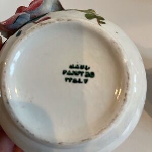 Two Hand-Painted in Italy Ceramic Bowls adorned with a Porcelain Rose. Good condition, No cracks, but slight nicks on a few rose petals and edge of one dish. Please zoom in pictures to see condition. Bowl diameter is 3” x H 2”, with handle 4”.