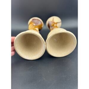 These unique goblets bring an artistic touch to any table setting. With their speckled beige tops and sculpted brown bases, they combine functionality with an eye-catching design. Perfect for serving drinks or as decorative pieces, they elevate the ambiance of any gathering. The stems have finger holds (right-hand). Handcrafted for uniqueness, these goblets make a thoughtful gift for housewarmings or special occasions. Enjoy sipping your favorite beverages in style with these delightful creations. 6.75" tall.