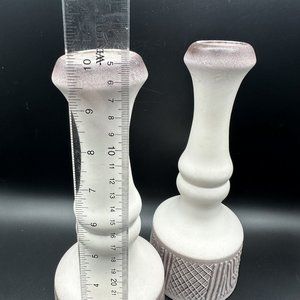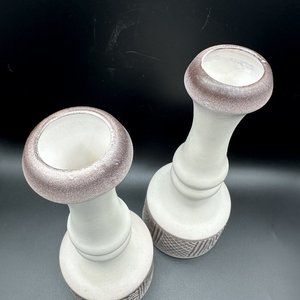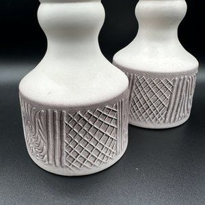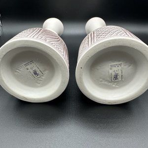 A pair of lovely judaica collectible vases made in Kibbutz Kfar Menachem in southern Israel. Unique textured scroll design with purple hues. Measures about 10.25" tall with original stickers and impressed markings. No chips or cracks