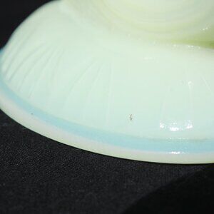 Here's a lovely pair of cornucopias made by "Fenton" in the pattern of "Ivory Crest". These guys glow beautifully under a blacklight and are in excellent condition! No chips, cracks, or scratches. There's a black scuff on the base of one, (Shown in the last picture) that we've been told can be removed with a Mr. Clear Magic Eraser. Made for just one year from 1940-1941. Measuring 6in. tall and 5 1/2in. wide.