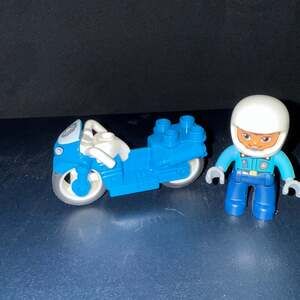 Two LEGO DUPLO Police Motorcycles each with a Police Officer figure. These vibrant blue motorcycles are perfect for small hands, featuring a sturdy design for early builders. The police officers come with white helmets and light blue uniforms, ready for imaginative play and adventures. Excellent pre-owned condition, with minimal signs of play. Ideal for developing fine motor skills and creative storytelling in young children.