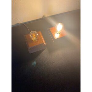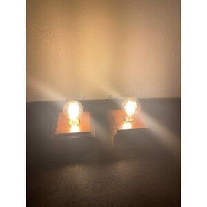 Pair Set of 2 Small Minimalist Contemporary Cube Square Wooden Block Desk Table Lamp Light Edison MCM