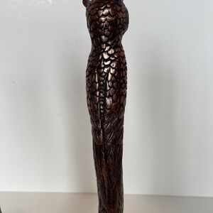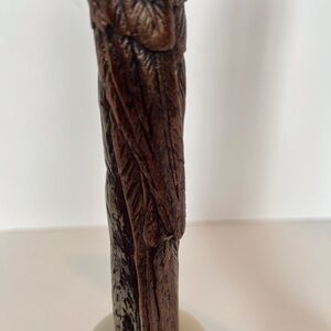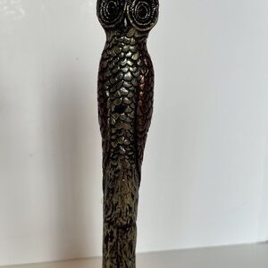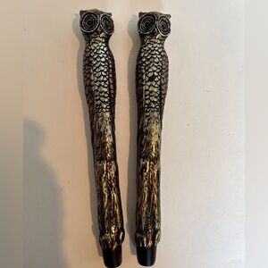 Candles in shapes of Owls, 10in tall. Has detailed owl facial features and feathered details in the wax. Coloring is a silvery, gold and bronze over a black undertone. Very unique!