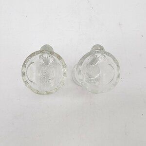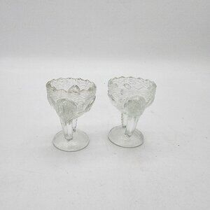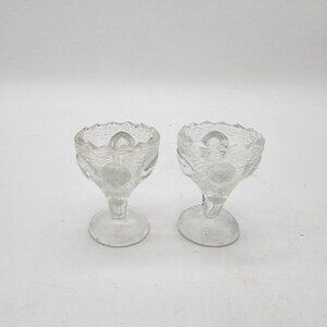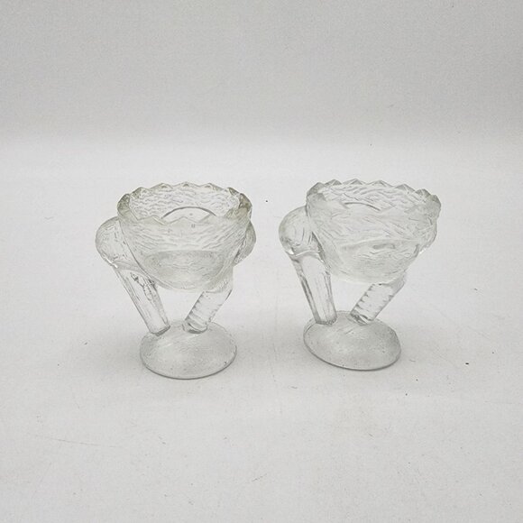 Elegant pair of pressed glass egg cups featuring a stork bird design. Perfect for adding a touch of charm to your breakfast table or as a unique gift for collectors.Their elegant silhouette and fine craftsmanship add a quaint touch to any table setting, making them a great choice for daily use or special occasions.