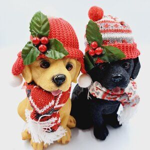 Pair of Resin Winter Holiday Golden Lab and Black Lab Puppies Figures