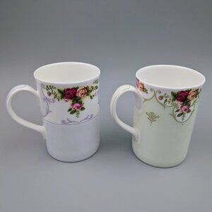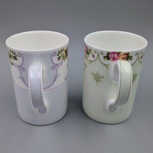 Add a touch of English elegance to your mornings with these exquisite Royal Albert mugs! Bring timeless elegance to your tea or coffee ritual with this beautiful pair of Royal Albert Rose Cameo mugs. Featuring delicate pink, yellow and red rose floral patterns in a graceful cameo design, these bone china mugs embody the charm and quality that Royal Albert is famous for. Perfect for afternoon tea, display in a china cabinet, or as a thoughtful gift for a collector or tea lover. One mug is violet, the other green. Capacity is about 10 fl. oz. Royal Albert backstamp on bottom of each mug.