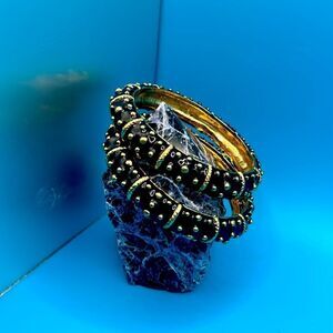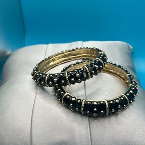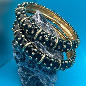 The black enamel and gold tone Sea Urchin bangle design was released in November of 2022. Research demonstrates that this black style is hard to find . Each bangle has 2.75” diameter and 1/2” wide. Both bangles in excellent condition and both are signed . Get the pair and make a statement !