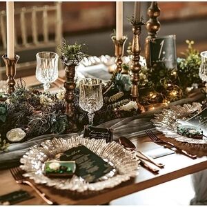 Add a touch of sophistication to your #dining experience with this Pair of Silver Reef Charger Plates. Crafted from premium glass, these #textured holiday platters gleam with a #silver iridescent hue. Each plate measures approximately 12.75" in diameter, providing ample space for your finest dishes. Sold as a lot of 2 plates, these exquisite pieces are new without tags, ensuring they arrive in pristine condition, free from chips, cracks, or repairs.