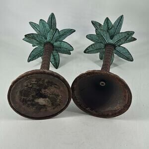 Pair of Tropical Palm Tree Heavy Metal Taper Candle Holders. Measures about 8" T. In vintage condition, bottom liner missing on one and they feel like they were used outdoors.