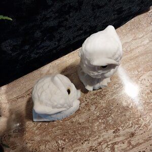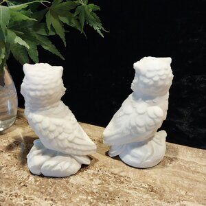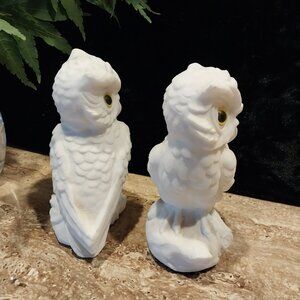 Pair of owls with triking yellow eyes and white, textured plumage, delightful pair for collectors and owl enthusiasts alike.