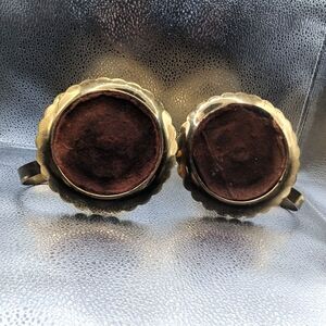 A pair of vintage brass candlestick holders with blue hobnail glass hurricane or votive shades. These decorative pieces feature heavy brass bases and distinctively textured blue glass inserts with a "hobnail" or "thousand eyes" pattern. They combine vintage craftsmanship with vibrant blue glass accents and are often associated with Mid-Century Hollywood Regency or Colonial Revival styles