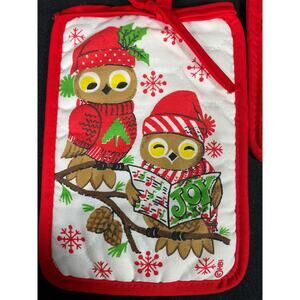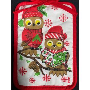 Pair of Vintage Christmas quilted Pot Holders, Owls Caroling, Wooden Rings, Red Bow