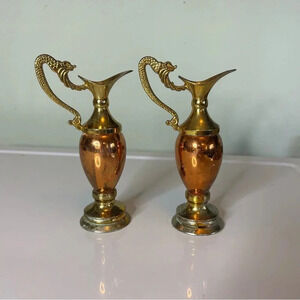 tags: vintage copper ewers, brass dragon handle pitchers, antique brass ewers, decorative metal pitchers, pair of vintage ewers, ornate dragon handle jugs, collectible copper pitchers, brassware with dragon motifs, antique metal ewers, vintage oriental style pitchers