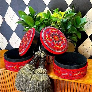 Pair of Vintage Embroidered Fabric Boxes | Hand-Stitched • Round • Red