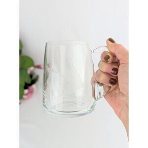 This pair of vintage handblown glass beer glasses combines rustic charm with artisanal craftsmanship. Each glass features an intricately etched scene of a goose flying gracefully over cattails, a design that evokes serene natural landscapes. The sturdy handles and heavy, concaved bottoms provide both style and practicality, making these glasses as functional as they are decorative. Their unique handles and subtle variations in craftsmanship highlight the handblown artistry, adding to their appeal. Each glass measures 4.5" tall, 2.75" wide at their rim and are in excellent vintage condition with no noted chips or scratches.
