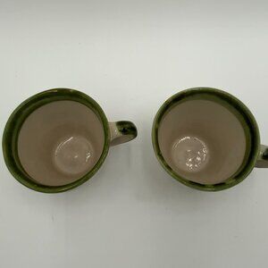This pair of vintage stoneware coffee cups by John B. Taylor Ceramics features a charming Harvest Pear pattern that's perfect for all occasions. The cups are round in shape, with a glossy finish and a green color that will complement any decor. Each cup is handmade and suitable for hot beverages, with a handle for easy grip. They measure 3.5 inches in height and 3.75 inches in diameter, with a total weight of 1 1/4 pounds. This item is an original vintage piece, perfect for collectors and lovers of unique, handmade items.