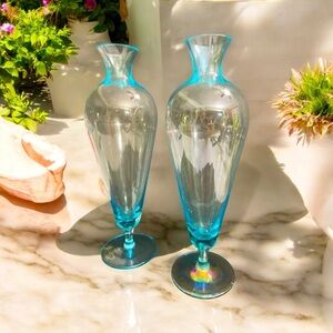Pair of Vintage Mid-Century Modern Light Blue Art Glass Vase Footed