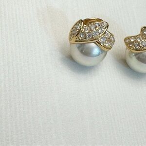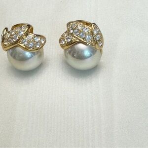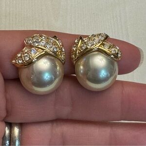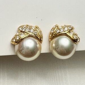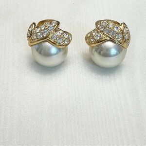 These versatile clip on earrings feature a faux pearl set in a bezel setting, semi-encircled with a spiral of gold tone and sparkling, clear, faceted, pave rhinestones.