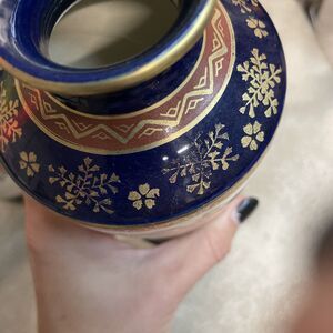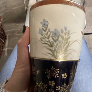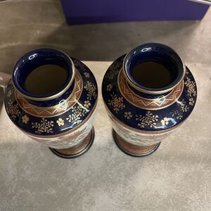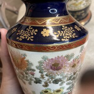Pair of Vintage Satsuma Pottery Vases 7.5” Floral Blue Gold Signed