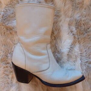 Pair of Vtg White Square Toe Boots, Women's Size 9 EE, Rancho, Made in Mexico, 2 & 3/4" heel, short shaft. Visible wear, with scuffs, see pics. Plenty of miles to go on these soles. In very good vintage condition. Shaft approx H: 5". These boots are super cool! Saw a lot of rock shows in these in Austin, Texas. The heels are solid!