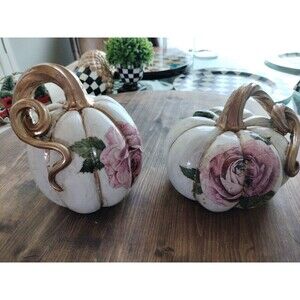 Add some charming flair to your home this season with this delightful pair of resin pumpkins. These whimsical pumpkins feature beautiful pink roses, adding a touch of femininity to your decor. The larger pumpkin measures 6 inches while the smaller one measures 5 inches, making them perfect for displaying together or separately.