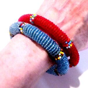 Pair of Wrapped Seed Bead Bangle Bracelets in Red and Blue