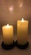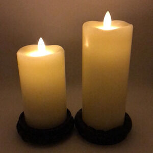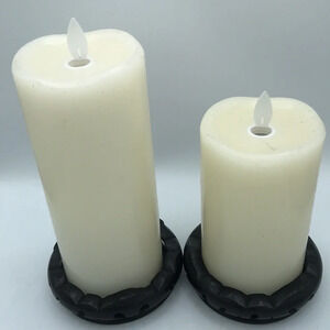 Pair of flameless real wax candles and holders. Gently preowned condition. Each candle takes four AA batteries (not included). They look white during the day but yellowish when turned on at night. Out of the holders, one is 7” tall and the other is 5” tall. Both are 3” in diameter.
