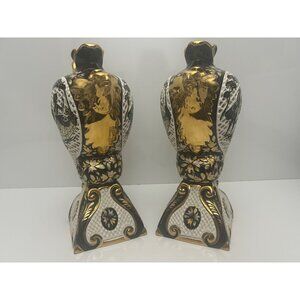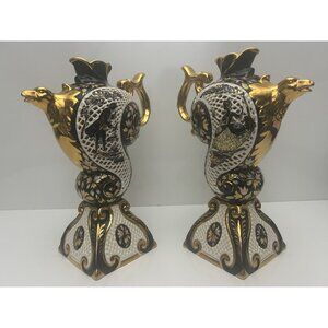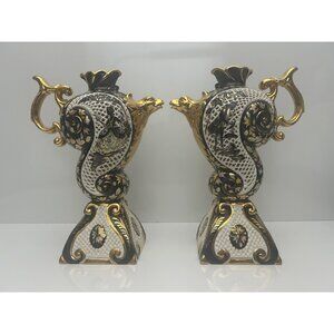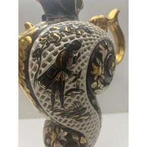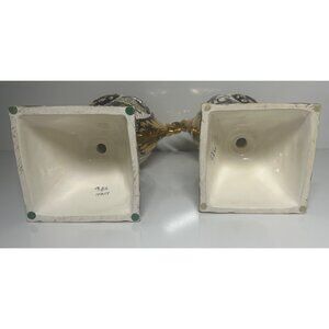 This listing is for an exquisite pair of reticulated and gilded Rococo style ewers with a golden bird, flower and 1700's couple motif. Bottom of both pieces are marked with " 1386 Italy " with no other markings. (We therefore believe these to be older dating back to prior to laws requiring disclosure of "made in" information or made for Italian consumers rather than for export.) These ornate decorative ewers feature intricate reticulated (pierced) detailing and gold gilt accents typical of Italian ceramic craftsmanship. The pieces showcase elaborate scrollwork, floral motifs, and the characteristic colorful glazed technique of majolica, with these hand-painted details demonstrating skilled artisanship.