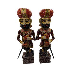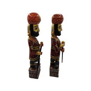 Pair of rajasthani wooden statue handicraft painted royal gate keeper watch man