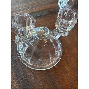 Pair of vintage Imperial Glass double candlestick holders in the "Crocheted Crystal" pattern. Manufactured by the Imperial Glass Company in Ohio, between 1930’s and 1950s. Named after the raised band at the bottom of the bell-shaped base, which resembles crochet work. Designed to hold 2 taper candles. Excellent vintage condition. Great for hosting holiday parties, showers, setting a pretty table, etc.