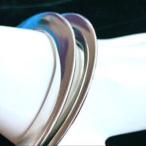Really elegant and smart super thin modern bangle disk style bracelets. Super shiny simple smooth finish, these will accent almost anything that you can wear them with. Excellent condition. See all photos for full description.