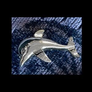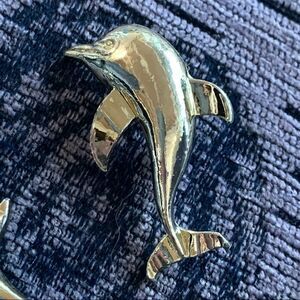 Really pretty and sleek swimming dolphins in shiny silver. Wear these together or alone, excellent condition, really fun pair of pins, brand Gerry, sipped to you in a box. Measures 2” long for the larger pin 1.5 “ for the smaller.