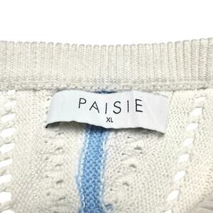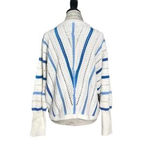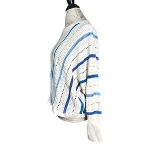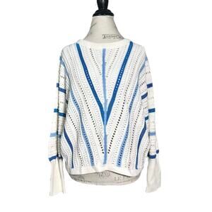 Pre-owned women’s Paisie pointelle crochet knit multi-stripe sweater top with dolman sleeves and long ribbed cuffs.
