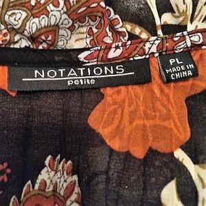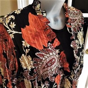 Adorable boho-chic floral and paisley blouse by Notations! Ruffled edges and bell sleeves. Shown here layered over a black tank.