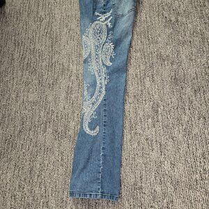 These jeans are an original design by Daniel. They are size 7-8 and consist of 20.9% polyester, 18% spandex, 54.4% ramie, 22.5% cotton. Machine wash cold water, hang dry only. They are made in China. These jeans were gently worm and are in good shape. Add a little designer embellishment to your wardrobe with these paisley jeans with Soutache embroidery and tiny sequins in white.