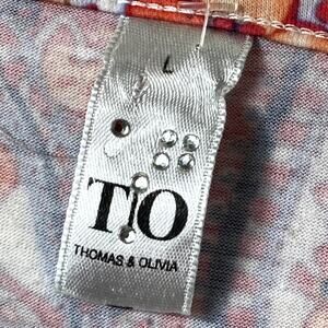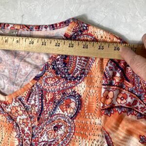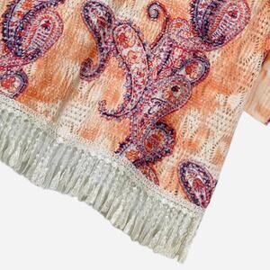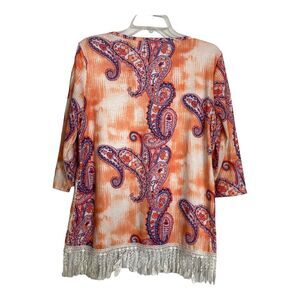 Lightweight stretch knit orange paisley pullover top. V-Neck with 3/4 sleeves. Openwork with lining and lace fringe hem.