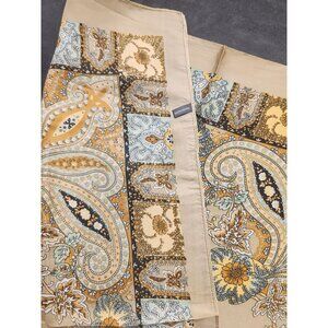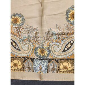 This 27-inch square scarf features a stunning vintage-inspired paisley and floral design in beautiful multicolor tones, including beige, mustard yellow, and soft blue accents. Crafted with attention to detail, this scarf showcases a bordered hem and an intricate pattern perfect for subtly elevating a wardrobe. Its smooth fabric adds a touch of elegance and versatility, making it suitable for wear as a scarf, shawl, or headpiece. New with tags, this accessory offers pristine condition, ready to enhance a variety of outfits.