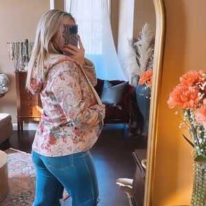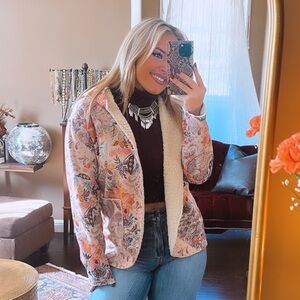 Sherpa lined jacket with pockets and hood. true to size. model is wearing a size S. beautiful colorful paisley print