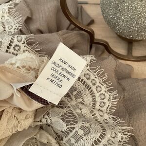 The Paisley Grace Tunic Top for women in size M is a stylish and versatile piece suitable for various occasions such as travel, casual outings, and workwear. This beige and brown tunic features a sleeveless design, a round neckline, and a pullover closure. Accented with lace and ruffles. Made from a blend of polyester and rayon, this lightweight tunic is lined and perfect for all seasons.