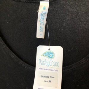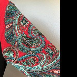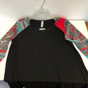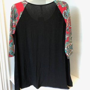 Size medium top is meant to have an oversized fit and is 22” pit-to-pit, 29” long. Top is black rayon/spandex and is really soft and stretchy. Sleeves are colorful paisley in a poly/spandex blend. New with tags.