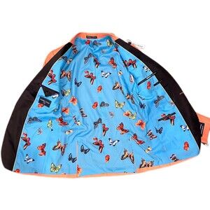 Paisley interior chest pocket Side vents Fully lined Complimentary pocket square matches jacket lining