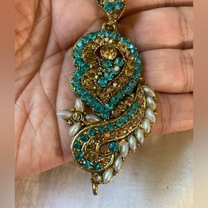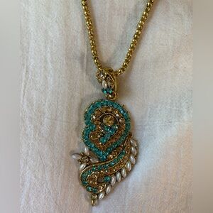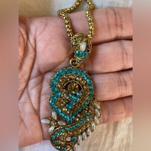 Paisley Jeweled Pendant Necklace Bollywood Blue Stones Faux Pearls