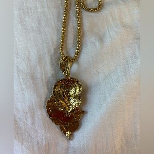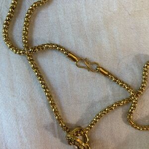 Stunning pendant necklace! The gold tone chain is approximately 16”. The pendant drops at 3”.